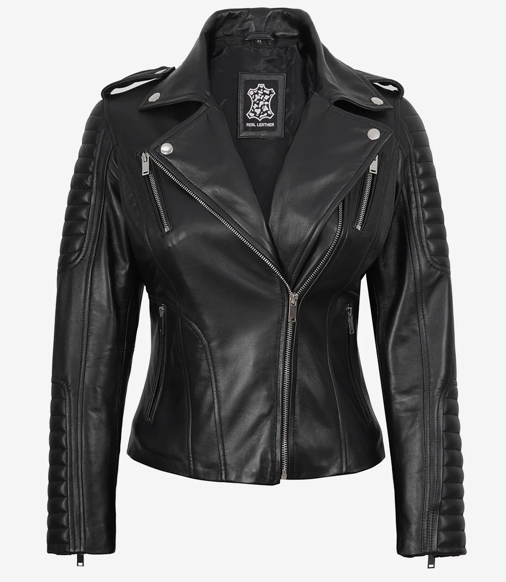Made from 100% real lambskin leather, it features a bold asymmetrical zipper, quilted shoulders, and a smooth tapered silhouette that instantly upgrades any outfit.