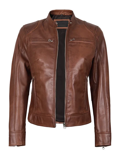 Made from waxed real lambskin leather, the Dodge women’s jacket brings a warm cognac tone with a modern biker-inspired edge. The smooth zipper closure, polished detailing, and soft polyester lining make it comfortable to wear on city outings, weekend plans, or casual everyday layering.
